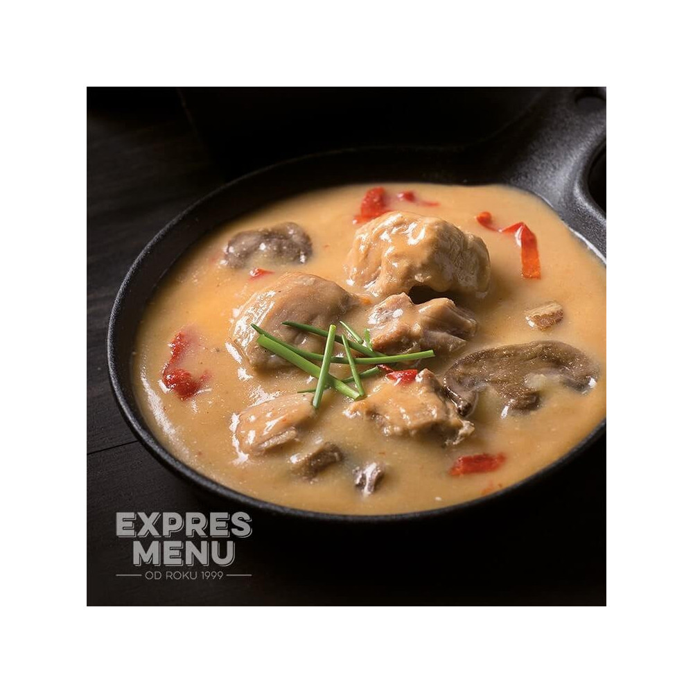Vepřová kýta a krůtí maso s omáčkou na uzeném špeku, s restovanou cibulkou, žampiony a česnekem. Pikantnost pokrmu dodávají feferonky a chilli.