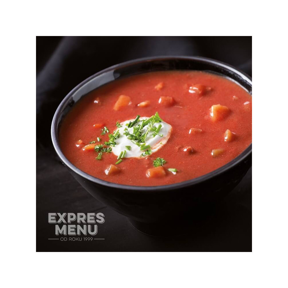 Hutná svačinová polévka z červené řepy s kousky hovězího a vepřového masa dušeného na kořenové zelenině s bramborem a hlávkovým zelím, zjemněná smetanou.