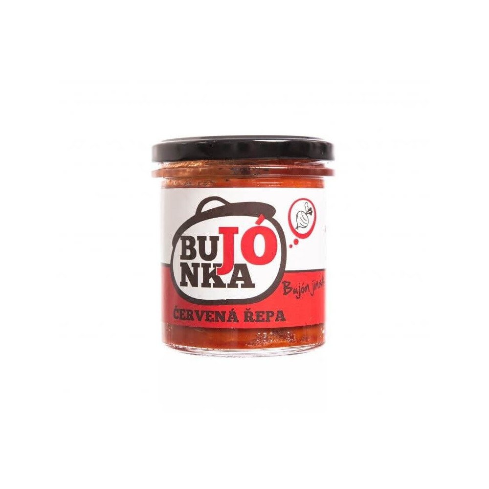 - zelenina 87,5% (řepa červená, mrkev, celer, rajče, cibule, petrželová nať), hrubozrnná mořská sůl 12%, olivový olej 0,5%, kmín.