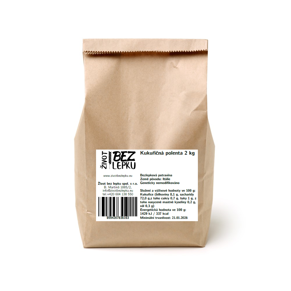 Bezlepková instantná forma varenej kukuričnej krupice vyrobená zo surovín, ktoré neboli geneticky modifikované.