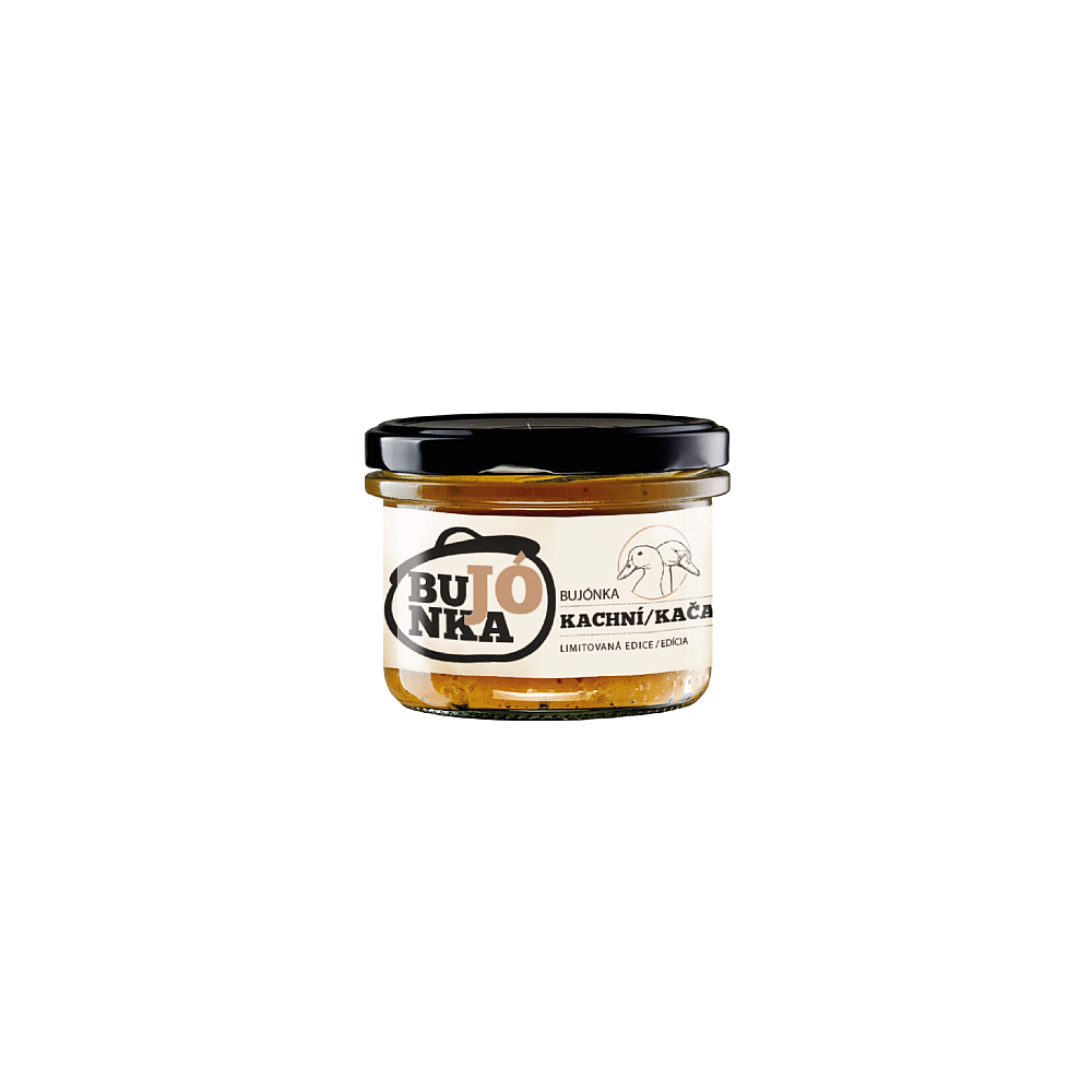- Zelenina 51% (kapusta biela, cuketa, cibuľa, mrkva, zeler, petržlen), Kačacie prsia 37%, Hrubozrnná morská soľ 11%, rasca, bobkový list.